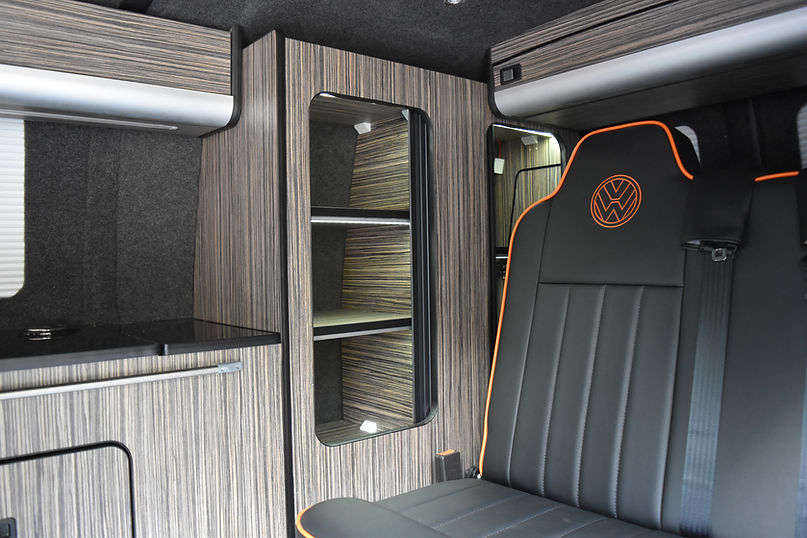 In this 2-berth conversion we used a Rusty Lee 3/4 bed, in black vinyl and orange piping, with orange VW embroidered logos. This bed was fitted with a certified fitting kit from Rusty Lee, provided with a certificate.